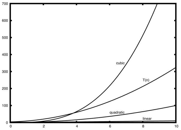 In addition, the coefficient $5$ becomes insignificant as $n$ gets large. We would say then that the function $T(n)$ has an order of magnitude $f(n)=n^2$, or simply that it is $O(n^2)$.