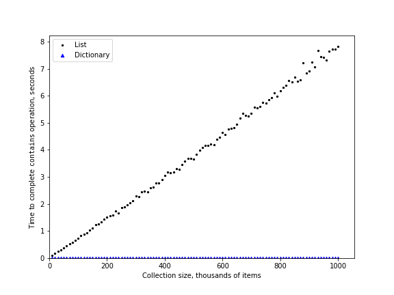 You can see that the dictionary is consistently faster. You can also see that the time it takes for the contains operator on the list grows linearly with the size of the list. This verifies the assertion that the contains operator on a list is $O(n)$. It can also be seen that the time for the contains operator on a dictionary is constant even as the dictionary size grows.